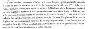 “Last year, on my way back from Oxford, I came through Brighton; it was holiday time; the bathing season was drawing to a close. On the pier, I met Miss P****. I saw her. I fell in love with her; but, as I was still a student at that time, I could not ask her father for her hand there, right next to the Ocean, on a promenade built like a paddleboat on the water. One strikes up acquaintances quickly in seaside towns; I was rapidly informed of the father’s tastes. Dr P**** devoted himself exclusively to the study of stomach disease and all forms of gastritis. For him, the chalybeate springs of Brighton are the foremost in the world. So, in order to become his son-in-law, I had first to become his patient and to effect a miracle cure, one of those resounding medical achievements that no one can gainsay.”