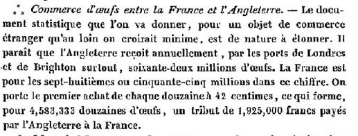 Apparently, according to the Review, England was importing, via the ports of London and Brighton, no less than sixty-two million eggs annually. France was providing not less than fifty-five million of these eggs. The Review goes on rapidly to tot up how much revenue France was gleaning from England. At 42 centimes per dozen, that added up to 1,925,000 francs a year.