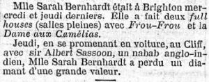 [Mlle Sarah Bernhardt was in Brighton last Wednesday and Thursday.  She played to two full houses with Frou-Frou and The Lady of the Camelias.   On Thursday, during a drive along the Cliff with Sir Albert Sassoon, an Anglo-Indian tycoon, Miss Sarah Bernhardt lost a very valuable diamond.]