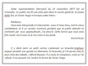[“This performance (of Hernani by Victor Hugo) on 21 November 1877 was a triumph.  I had my fair share of the success.  I was playing Dona Sol and Victor Hugo sent me this note: