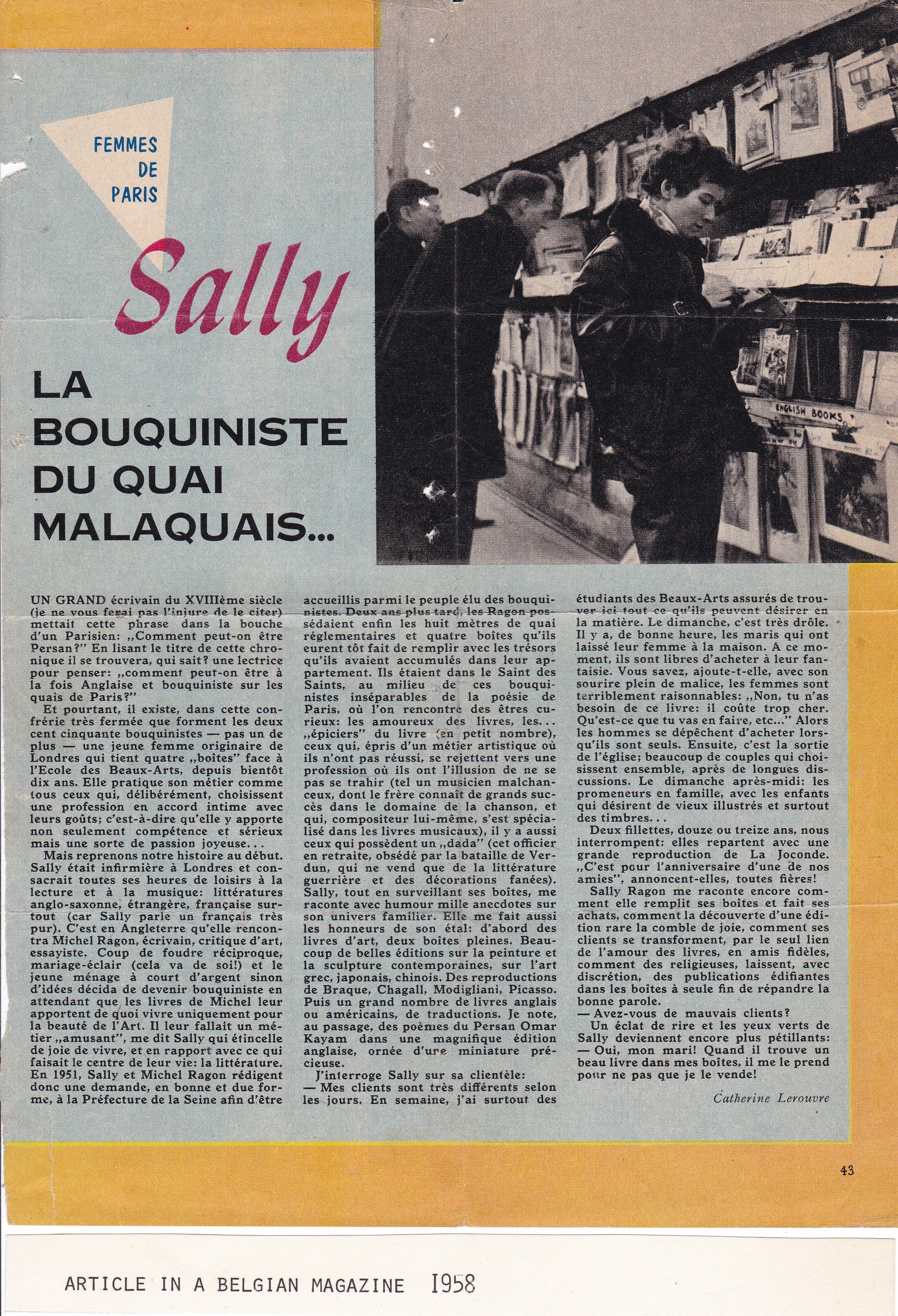 While Sally worked at the hospital, Michel divided his time between his writing and his bookstall. After a while, he began to earn more from writing, so Sally gave up her nursing job and took over the bookstall, which was on the Quai Malaquais, near Saint-Germain-des-Prés. She became the first foreign bouquiniste and was quite a celebrity – she was profiled by French and Belgian magazines, and by the Sunday Express. In an article published in the magazine Femmes d’Aujourd’hui in 1958, she described herself as “une femme heureuse, qui n’a pas l’impression de travailler, simplement d’occuper agréablement son temps, en compagnie des livres …” [A happy woman who doesn’t feel as if she is working, just using her time agreeably in the company of books.]