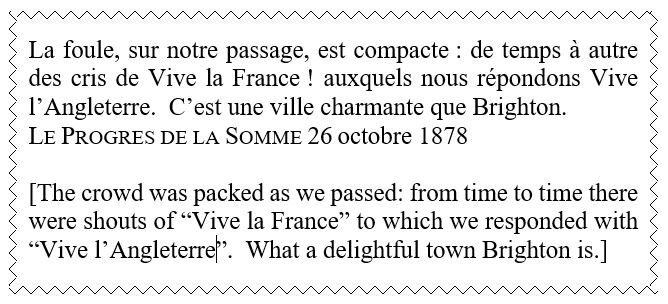 The Brighton Gazette was pleased to note that: “They (the French musicians) do not offer their patrons the wretched trash which, alas, one hears so much nowadays, but only music of the highest class.”  But above all, the same newspaper emphasised that the visit had a deeper meaning than just entertainment: