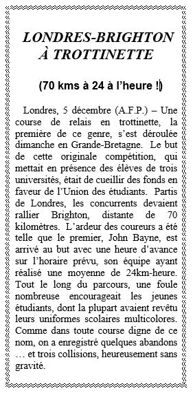 London, 5 December (Agence France Presse) – A scooter relay race, the first of its kind, took place in Great-Britain on Sunday. The aim of this unique competition, in which students from three universities competed, was to collect funds for the Union of Students. Having left London, the competitors had to reach Brighton 70 miles away. So great was the participants’ excitement that the first to cross the line, John Bayne, arrived at the finishing line an hour before the scheduled time, his team having managed an average of 24km per hour. Along the whole length of the course, there were large crowds to encourage the young students, most of whom were in their colourful academic gowns. As with any race worthy of the name, several competitors abandoned … and there were three collisions, fortunately none of them serious.