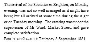 Arrival in Brighton in the dark, in the rain, was already a poor start to the visit. To add to their woes, there was no-one to greet the group at the station. Their conductor, M. Félix Boisson, had to set off to find the organisers. M. Chérifel de la Grave was not at home at 15 King’s Road. M. Boisson had to rely on a friendly (if uncomprehending) cab driver to take him on to next address where he might find at least one of the organisers. Eventually a bed was found for each of the 60 members of the group. M. Boisson fell into bed, exhausted, at about 2 am.