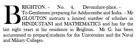 We must either imagine that Mons. Glouton was a prodigious polymath. Or that he could call on a large part-time staff knowledgeable in a wide range of subject and languages. Or that he was over-reaching himself. Or that the imminent closure of The East India Company College at Halleybury in 1858 was his final undoing. Whatever the case, in 1857 John Sebastian Glouton, by then of 37 Norfolk Road, Brighton, became insolvent and “came up for his first examination” for bankruptcy that July. His debts amounted to £626 10s. 9d. His assets were a mere £82.