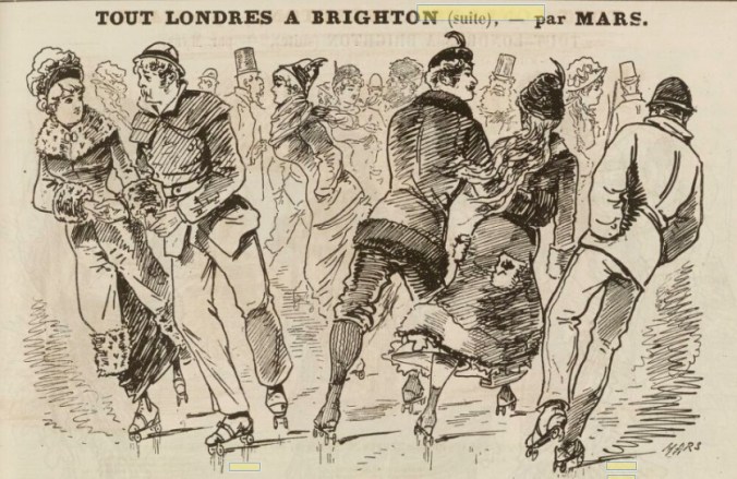 And then the perennial subject of l’amour or le flirt comes to the fore. The roller skating rink at the Brighton Aquarium had opened in 1876. English engravings saw this form of entertainment as being rather decorous.