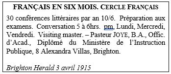 This little snippet seems to show that Antoine Désiré Joye, teacher of French and Pasteur of the French Protestant Church in Queensbury Mews (see blog of December 2016) was at the fountainhead of the Cercle Français. For 10/6d you could attend a course of 30 lectures on literature given by the man himself.